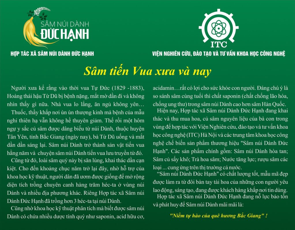 Hiện nay, Hợp tác xã Sâm núi Dành Đức Hạnh đang khai thác và thu mua hoa, củ sâm nguyên liệu của bà con trong vùng để hợp tác với Viện Nghiên cứu, đào tạo và tư vấn khoa học công nghệ (ITC) Hà Nội và các trung tâm khoa học công nghệ chế biến sản phẩm thương hiệu “Sâm núi Dành Đức Hạnh”. Các sản phẩm chính gồm: Sâm núi Dành hòa tan; Sâm củ sấy khô; Trà hoa sâm; Nước tăng lực; rượu sâm các loại … cung ứng trên thị trường cả nước.
